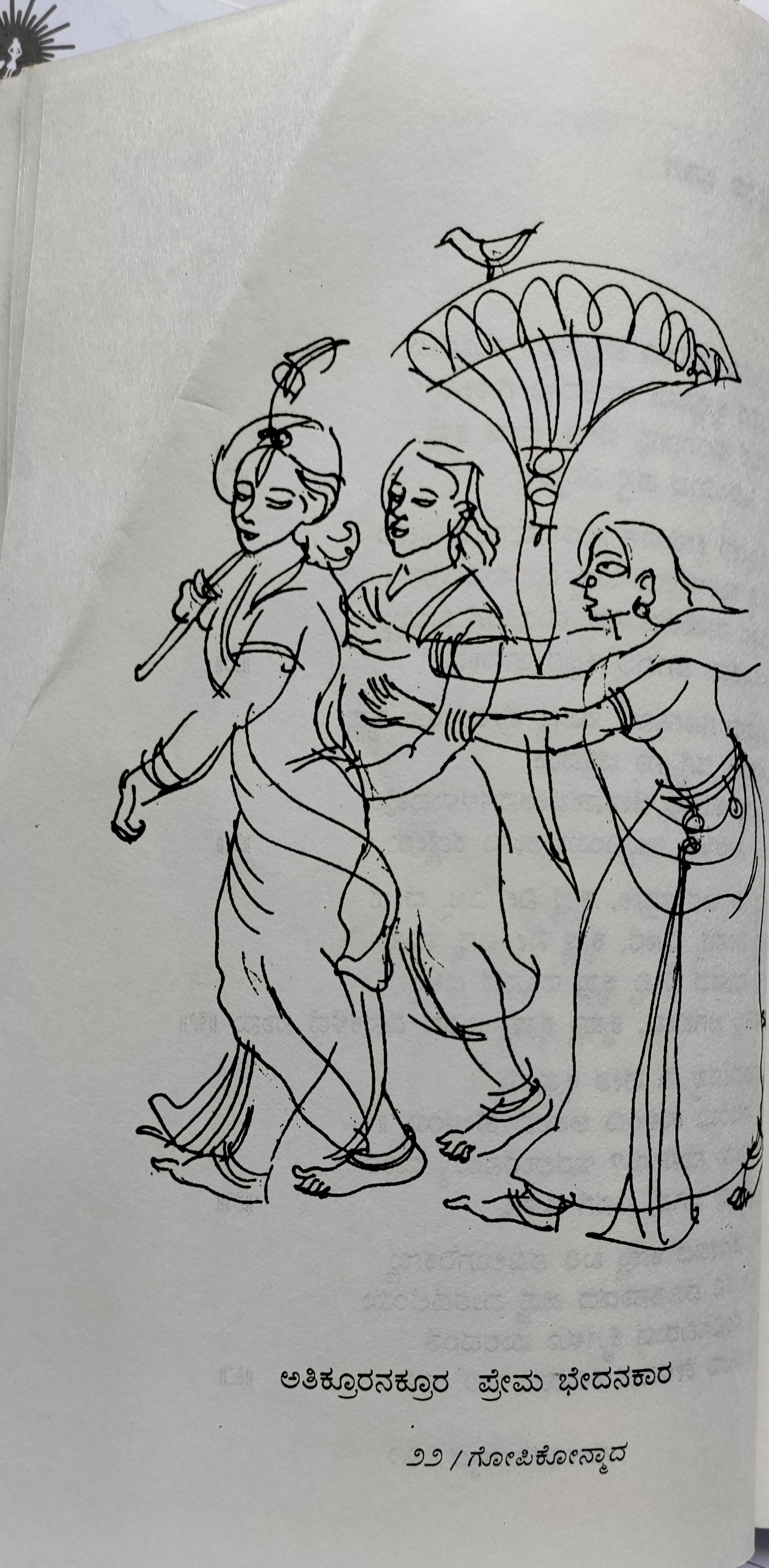 ಪುರಿಯಲ್ಲಿ ಜಗನ್ನಾಥನ ರಥವನ್ನು ಎಳೆಯುವ ದೃಶ್ಯ ಇಲ್ಲಿ ನೆನಪಾಗುತ್ತದೆ. ಯಾವ ಬೇಧವಿಲ್ಲದೇ ರಥಎಳೆಯುವಾಗ ತಾನ್ಯಾರೋ, ಅವರ್ಯಾರೋ, ಅಲ್ಲಿ ಕಾಣುವದು ಕೃಷ್ಣ ಬಲರಾಮರು ಮಾತ್ರ ಎನ್ನುವ ಭಾವ ಅಲ್ಲಿಗೆ ಹೋದವರಿಗೆ ಬರುವಂತೆ ಇಲ್ಲಿ ಗೋಪಿಗೆ ಆಗುತ್ತದೆ. ನಾಚಿಗೆಯಿಂದ ನಿಂತವಳನ್ನು ಕೃಷ್ಣ ತೆಕ್ಕೈಸಿ ಅಪ್ಪಿ ಮುದ್ದಡುತ್ತಾನೆ. ಗೋಕುಲದಲ್ಲಿ ಸೀರೆಯ ಸೆರಗು ಎಳೆದಿದ್ದ ಕೃಷ್ಣ ಇಲ್ಲಿ ಆಕೆಯ ಅಹಮಿಕೆಯ ಉನ್ಮಾದವನ್ನು ಕಳಚುತ್ತಾನೆ. ಈ ಭಾಗವನ್ನು ಪ್ರೋ. ರಾಧಾಕೃಷ್ಣರು ರೂಪಾಂತರಿಸಿರುವದನ್ನು ಓದುತ್ತಲೇ ಇರಬೇಕೆನಿಸುತ್ತಿದೆ.