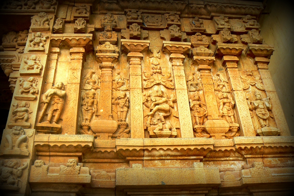 ದ್ವಾರದ ಅಕ್ಕಪಕ್ಕದ ಗೋಡೆಗಳ ಮೇಲಿನ ನಾಟ್ಯಶಿವ, ಭೈರವನ ಮೂರ್ತಿಗಳು ಹಾಗೂ ಗಣಪತಿಯೇ ಮೊದಲಾದ ಶಿವನ ಪರಿವಾರದವರ ಶಿಲ್ಪಗಳ ಕೆತ್ತನೆ ಅತ್ಯಾಕರ್ಷಕವಾಗಿದೆ. ದ್ವಾರದ ಅಂಚಿನ ಚೌಕಟ್ಟಿನುದ್ದಕ್ಕೂ ವಿವಿಧ ಭಂಗಿಗಳ ಯಕ್ಷರ ಮೂರ್ತಿಗಳಿವೆ. ದ್ವಾರದ ಒಳಬದಿಯ ಎರಡೂ ಕಡೆ ಕಂಬಗಳ ಮೇಲೆ ಸೂಕ್ಷ್ಮಕೆತ್ತನೆಯ ಬಳ್ಳಿಗಳನ್ನು ಆಧರಿಸಿ ನಿಂತ ಶಿಲಾಸುಂದರಿಯರು ಕಾಣಿಸುತ್ತಾರೆ. ಈ ಅಪೂರ್ವ ಉಬ್ಬುಶಿಲ್ಪಗಳೂ ಬಳ್ಳಿಯ ಚಿತ್ತಾರಗಳೂ ಒಂದಕ್ಕಿಂತ ಒಂದು ಮಿಗಿಲಾಗಿ ಕಣ್ಮನ ಸೂರೆಗೊಳ್ಳುತ್ತವೆ.