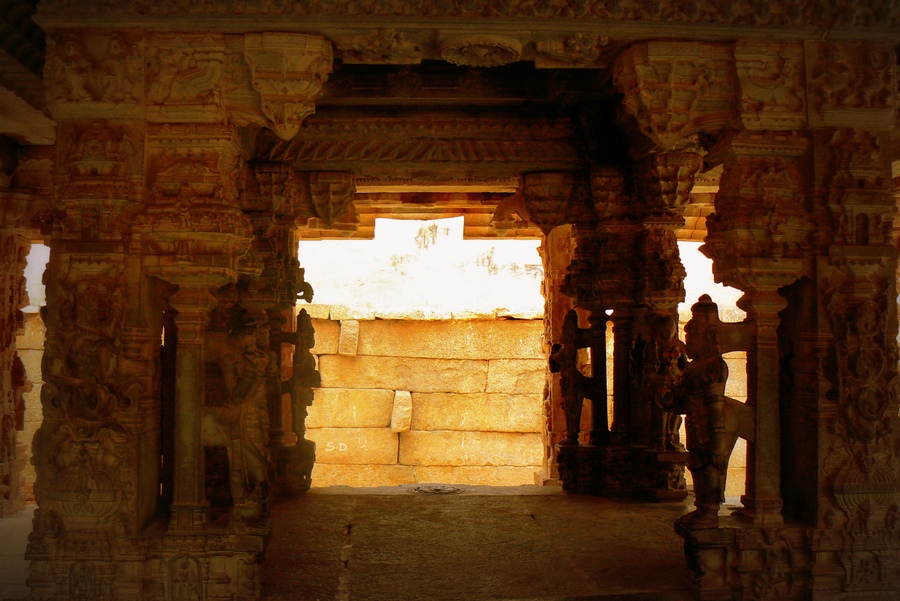 ದೇವಾಲಯದೊಳಗೆ ಕಾಲಿರಿಸುತ್ತಿದ್ದಂತೆ ಕಟ್ಟಡದ ತುಂಬೆಲ್ಲ ನಿಂತ ಭವ್ಯವಾದ ಕಂಬಗಳು ಬೆರಗುಗೊಳಿಸುತ್ತವೆ. ಇಂಥ ಅರವತ್ನಾಲ್ಕು ಕಂಬಗಳನ್ನುಳ್ಳ ಮುಖಮಂಟಪವು ದೇಗುಲದ ಪ್ರಮುಖ ಆಕರ್ಷಣೆ. ಮಂಟಪದ ಸುತ್ತಲಿನ ಪ್ರತಿಯೊಂದು ಕಂಬದಲ್ಲೂ ನಿಂತ ಭಂಗಿಯಲ್ಲಿರುವ ಸಿಂಹವೊಂದನ್ನು ಕೆತ್ತಲಾಗಿದ್ದು ಇವೆಲ್ಲ ಸಿಂಹಗಳು ಕೂಡಿ ಇಡಿಯ ಮಂಟಪವನ್ನು ಹೊತ್ತಂತೆ ಭಾಸವಾಗುತ್ತದೆ. ಪ್ರತಿ ಕಂಬದ ಮೇಲೂ ಚಿತ್ರವಿಚಿತ್ರವಾದ ಪ್ರಾಣಿಪಕ್ಷಿಗಳು, ಋಷಿಮುನಿಗಳು, ದೇವತೆಯರು, ಮಿಥುನಶಿಲ್ಪ, ನರ್ತಕಿಯರು ಮೊದಲಾದ ಉಬ್ಬುಶಿಲ್ಪಗಳನ್ನು ನೋಡಬಹುದು.