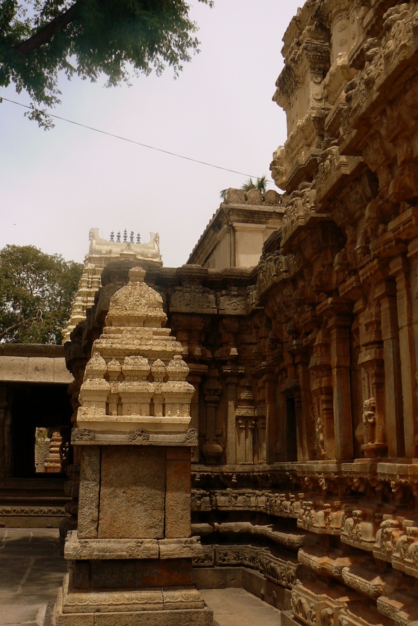 ದೇವಾಲಯದ ಸುತ್ತಲಿನ ಗೋಡೆಗಳ ಮೇಲೆ ದೇವತಾಮೂರ್ತಿಗಳೇನೂ ಹೆಚ್ಚಾಗಿಲ್ಲ. ಆದರೆ, ಕೆಳಭಾಗದ ಅಧಿಷ್ಠಾನದ ಮೇಲೆ ಆನೆ, ಸಿಂಹ, ಹಂಸಗಳೇ ಮೊದಲಾದವುಗಳನ್ನು ಕೆತ್ತಲಾಗಿದೆ. ಗೋಡೆಯುದ್ದಕ್ಕೂ ಚಿಕ್ಕ ಚಿಕ್ಕ ಕಂಬಗಳು ಅವುಗಳನ್ನು ಜೋಡಿಸಿದಂತೆ ಚಿಕ್ಕ ಗೋಪುರಗಳಿದ್ದು ದೇಗುಲದ ವಿನ್ಯಾಸಕ್ಕೆ ಮೆರುಗು ನೀಡಿವೆ. ಈ ಕಂಬಗಳ ಮೇಲೆ ವಿವಿಧ ಭಂಗಿಗಳಲ್ಲಿ ತಪಸ್ಸಿಗೆ ನಿಂತ ಮುನಿಗಳು ಹಾಗೂ ಭಕ್ತರ ಉಬ್ಬುಶಿಲ್ಪಗಳಿವೆ. ನಂತರದ ಕಾಲದಲ್ಲಿ ಗಾರೆಯಿಂದ ನಿರ್ಮಿತವಾದ ವಿಮಾನಗೋಪುರದ ನಾಲ್ಕು ಮೂಲೆಗಳಲ್ಲಿ ನಂದಿಯ ವಿಗ್ರಹಗಳಿವೆ.