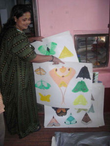 ಅಲ್ಲಿನ ಕಲಾಕೃತಿಗಳ ಬಗ್ಗೆ ನನ್ನ ಕುತೂಹಲ ಕಂಡ ಗೋವಿಂದಯ್ಯನವರು ‘ನನ್ನ ಭಾವನ ಮಡದಿ ಭಾರತಿ, ಮನೆಯೊಳಗೆ ಬಂದ್ಹೋಗೊ ಚಿಟ್ಟೆಗಳ ಚಿತ್ರ ಬಿಡಿಸಿದ್ದಾಳೆ. ಏ ತಾಯಿ! ನೀನು ಮಾಡಿರೊ ಪೇಂಟಿಂಗ್ ತೋರಿಸು’ ಎಂದರು. ಆಗ ಆಕೆ ಸಂಕೋಚ ಪಟ್ಟುಕೊಂಡು ಒಳಗಿಂದ ಒಂದು ಚಿತ್ರ ತಂದರು. ಗೀರುಗಳುಳ್ಳ ಲೆಡ್ಜರ್ ಹಾಳೆಯಲ್ಲಿ ಬಿಡಿಸಿದ ಚಿಟ್ಟೆಯ ಆ ಚಿತ್ರ ಅಪೂರ್ವವಾಗಿತ್ತು. ಸಮುದ್ರದ ಜಲಚರದಂತಿದ್ದ ಅದು ಮೂರು ಕಡೆ ಅರೆನಿಮೀಲಿತ ನೇತ್ರಗಳನ್ನು ಒಳಗೊಂಡಿತ್ತು. ಗಾಳಿಪಟದಂತೆ ಬಾಲಂಗೋಚಿಯನ್ನು ಹೊಂದಿತ್ತು. ಅದರೆ ರೆಕ್ಕೆಯ ನಕ್ಷೆಯು ಬೇಂದ್ರೆಯವರ ಪಾತರಗಿತ್ತಿ ಪಕ್ಕಪದ್ಯದ ಬಣ್ಣನೆಯನ್ನು ಮೀರಿಸುವಂತಿತ್ತು. ನಮ್ಮ ಪ್ರತಿಕ್ರಿಯೆ ಕಂಡ ಬಳಿಕ ಒಳಗಿಂದ ಒಂದೊಂದೇ ಚಿತ್ರಗಳು ಹೊರಬರತೊಡಗಿದವು. ನೋಡುತ್ತ ಹೋದಂತೆ ಹಲವಾರು ಬಣ್ಣಗಳ ನೂರಾರು ಡಿಸೈನುಗಳ ಚಿಟ್ಟೆಗಳು ಸೋಜಿಗದಲ್ಲಿ ಅದ್ದಿದವು. ಈ ಸೋದರಿ ಮನೆಯೊಳಗೆ ಬಂದು ಗೋಡೆಗಳ ಮೇಲೆ ಕುಳಿತುಕೊಳ್ಳುತ್ತಿದ್ದ ಚಿಟ್ಟೆಗಳನ್ನೆಲ್ಲ ಇಲ್ಲಿ ಹಿಡಿದುಹಾಕಿದ್ದರು.
