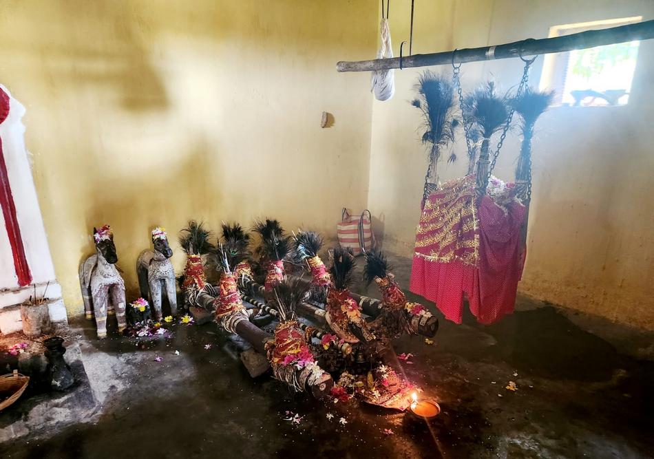 ಇದು ಬಸ್ತರ್ ಬುಡಕಟ್ಟು ಜನರ ದೇವಿಯಲೋಕವಾದರೆ ಅವರ ದಿನನಿತ್ಯ ಜೀವನದ ದೇವದೇವಿಯರದ್ದೇ ಒಂದು ಲೋಕವಿದೆ. ಅವರೆಲ್ಲಾ ಊರು ಕಾಯುವ ದೈವಗಳು. ಪ್ರಕೃತಿಯ ಜೊತೆ ಬದುಕುವ ಅವರಿಗೆ ನೆಲ, ಮರ, ಬೆಂಕಿ, ಗಾಳಿ, ನೀರು, ಎಲೆ, ಹೂವು ಎಲ್ಲವೂ ಅವರ ಪೂಜೆಗೆ ಒಳಗಾಗುವ ದೈವಗಳು. ನಮ್ಮ ಊರಲ್ಲಿ ಕರೆಯೋ ಹಾಗೆ ಅವರೂ ಕೂಡ ಅಂತಹ ಜಾಗಗಳಿಗೆ ಗುಡಿ ಎನ್ನತ್ತಾರೆ. ಬಹುತೇಕ ಗುಡಿಗಳಿಗೆ ಹೆಂಗಸರಿಗೆ ಪ್ರವೇಶವಿಲ್ಲ. ನನ್ನ ಆಸಕ್ತಿಯನ್ನು ಕಂಡು ಒಬ್ಬರು ತೀರ್ಥಮ್ನ ಒಂದು ಗುಡಿಗೆ ಕರೆದೊಯ್ದರು. ಅಲ್ಲಿ ಹೆಂಗಸರಿಗೆ ಪ್ರವೇಶದ ನಿರ್ಬಂಧ ಇರಲಿಲ್ಲ. ಗುಡಿಯ ಅಂಗಳದಲ್ಲಿ ಮರದಲ್ಲಿ ಮಾಡಿದ ಒಂದು ಜೋಕಾಲಿ ಇತ್ತು. ಅದರ ಹಲಗೆಯ ಮೇಲೆ ಕಬ್ಬಿಣದ ಮುಳ್ಳುಗಳನ್ನು ಮೊಳೆ ಹೊಡೆದಿದ್ದರು. ಹಬ್ಬಹರಿದಿನಗಳಲ್ಲಿ ಮೈಮೇಲೆ ದೇವರು ಬಂದಾಗ ಅಲ್ಲಿನ ಪೂಜಾರಿ ಅದರ ಮೇಲೆ ಕೂರುತ್ತಾರಂತೆ. ಇಷ್ಟು ಚೂಪಾಗಿರುವ ಮುಳ್ಳುಗಳ ಮೇಲೆ ಅವರು ಹೇಗೆ ಕೂರುವರು? ಅವರಿಗೆ ನೋವಾಗುವುದಿಲ್ಲವಾ ಅಂತ ನಾನು ಯೋಚಿಸಿದೆ. ಮತ್ತೊಂದು ಕಡೆ ಮರದ ಎರಡು ಸಣ್ಣ ಕಂಬಗಳನ್ನು ನಿಲ್ಲಿಸಿದ್ದರು. ಅದು ಕೂಡ ಅವರ ದೈವ. ಗುಡಿಯ ಒಳಗೆ ಎರಡು ಮೂರ್ತಿಗಳಿದ್ದವು. ಅವು ಏನು ಎಂಬುದು ತಿಳಿಯಲಿಲ್ಲ. ಅಲ್ಲಿನ ಪೂಜಾರಿಯ ಪ್ರಕಾರ ಅದು ಜಲದೇವತೆ. ಅದರ ಪಕ್ಕ ೩-೪ ಮರದ ಕೋಲುಗಳನ್ನು ಕಟ್ಟಿ, ಕೆಂಪು ಬಟ್ಟೆ, ನವಿಲುಗರಿಗಳಿಂದ ಅಲಂಕರಿಸಿದ್ದರು.