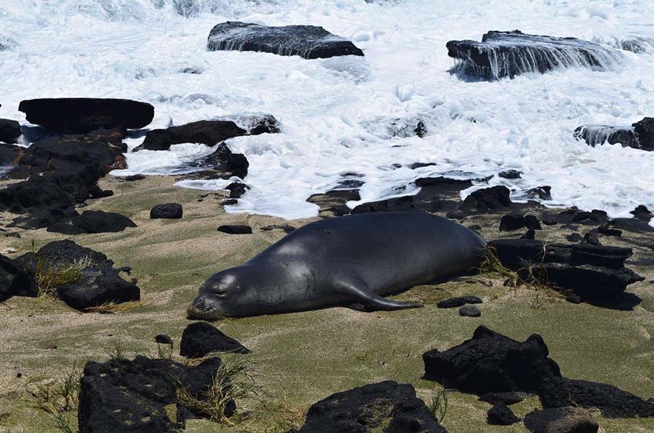 ಅಲ್ಲಿ ಹೋಗಿ ನೋಡಿದರೆ ಮಿರಮಿರ ಹೊಳೆಯುವ ದೈತ್ಯಾಕಾರದ ನೀರಾನೆ, ಮಕಮಾಯಿ ಹೇಳಿದ ಪ್ರಕಾರ, ಅದು ಮರಿ! ಚಂದವಾಗಿ ಬಿಸಿಲಲ್ಲಿ ಮೈಕಾಸುತ್ತ ಹತ್ತಿರ ಬರಬೇಡಿ ಎಂದು ನಮ್ಮನ್ನು ಸ್ವಲ್ಪ ಹೆದರಿಸುತ್ತ ಬಿದ್ದುಕೊಂಡಿತ್ತು. ಹೊಡೆಯುವ ಅಲೆಗಳ ನಡುವೆ ಕಪ್ಪು ಬಂಡೆಯ ಅಡಿಗೆ ಆಗಲೇ ಕಂಡವು ಅಲ್ಲಲ್ಲಿ ಫಳ ಫಳ ಹೊಳೆಯುವ ಹಸಿರು ಮರಳು! ನಿಜಕ್ಕೂ ಇರಬಹುದೇ ಎಂದು ವಿಸ್ಮಯವೂ ಸಂದೇಹವೂ ಮೂಡಿತ್ತು. ನೀವೇ ನೋಡುವಿರಂತೆ ಬನ್ನಿ ಎಂದು ಮತ್ತೆ ಜೀಪೇರಿಸಿ ಹೊರಡಿಸಿದ್ದಳು ನೀರಾನೆಯ ಜೊತೆಗಿದ್ದ ಮತ್ಸ್ಯಕನ್ಯೆ. ಇನ್ನೇನು ಕೊಂಚ ದೂರ ಸಾಗುವಷ್ಟರಲ್ಲಿ ಹಾದಿಯ ಕೊನೆಯಲ್ಲಿ ತೆರೆದುಕೊಂಡಿದ್ದು ಕಡಿದಾದ ಕೊರಕಲಿನಂಥ ಗುಡ್ಡದ ಏರು, ಕೊರೆದಿಟ್ಟಂತ ಒಂದು ಕಡಲ ಅಂಚು, ನೀಲಿಯೆಂದರೆ ನೀಲಿ ಸಮುದ್ರ, ಅಂಚಲ್ಲಿ ಪಚ್ಚೆಹಸಿರು ಮರಳು! ನಂಬಲಸಾಧ್ಯ ಬಣ್ಣದ ಮರಳು! ದೊಡ್ಡ ಬಟ್ಟಲಲ್ಲಿ ಪಿಸ್ತಾ ಪುಡಿಯನ್ನು ಹರಡಿಟ್ಟಂಥ ಮರಳು! ಹವಾಯಿಯ ಕಾಡಿನ ಮರಗಳ ಎಳೆಚಿಗುರನ್ನೆಲ್ಲ ಸಣ್ಣಗೆ ಪಲ್ಯಕ್ಕೆ ಹೆಚ್ಚಿಟ್ಟಂತೆನಿಸುವ ಮರಳು. ಹಾವಸೆಯ ಹಾಸೊ, ಮರಳ ದಂಡೆಯೋ ಎಂದು ತಿಳಿಯದಂಥ ಮರಳು.