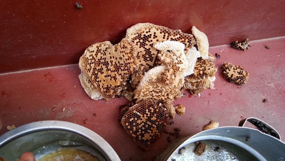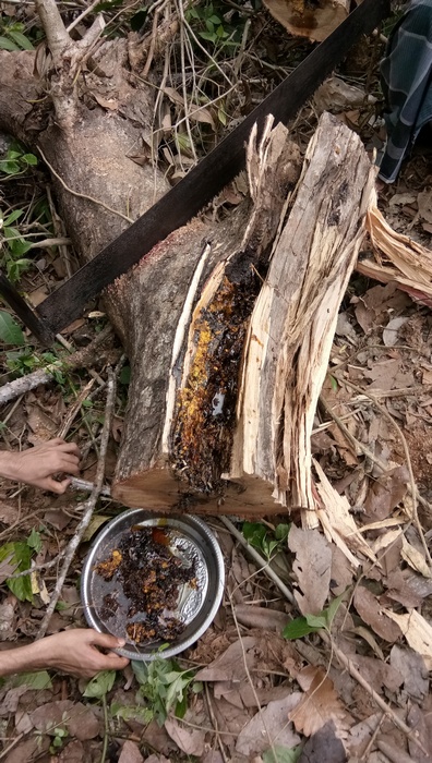 ನೋಡುವಾಗ ಟೊಳ್ಳು ಬಿದ್ದ ಮರದ ರಂಧ್ರಗಳಿಂದ ಜೇನ್ನೊಣಗಳು ಹಾರಾಡುತ್ತಿದೆ. ತೊಡುವೆ ಜೇನು, ಹೆಚ್ಚು ಕಚ್ಚುವುದಿಲ್ಲ. ಕಚಗುಳಿಯಿಟ್ಟಂತೆ ಮೈ ಮೇಲೆಲ್ಲಾ ಹರಿಯುತ್ತದೆ ಹೊರತು ನಿರುಪದ್ರವಿ. ಗರಗಸ ತಂದು ಮರವನ್ನು ತುಂಡು ತುಂಡಾಗಿ ಕತ್ತರಿಸಿ ಹಾಕಿದೆವು. ಎಲ್ಲರೂ ಒಂದೊಂದು ಪಾತ್ರೆ ಹಿಡಿದು ತಂದರು. ಒಂದೊಂದು ತುಂಡಿನಲ್ಲಿ ಸುಮಾರು ೨ ಲೀಟರಿನಷ್ಟು ಜೇನು ಲಭಿಸಿತ್ತು. ನಾಲ್ಕಾರು ಹಾಳೆಗಳು ಈಗಷ್ಟೇ ಕಟ್ಟುತ್ತಿದ್ದುದನ್ನು ಒಂದು ಪ್ಲಾಸ್ಟಿಕ್ ಪೈಪಿನೊಳಗೆ ಬಿಗಿದು ಕಟ್ಟಿದೆವು. ಎರಡು ದಿನ ಅಲ್ಲೇ ಇತ್ತಾದರೂ, ಬಿಸಿಲು ಹೆಚ್ಚಾಗಿ ಬೀಳುವುದರಿಂದಲೋ ಅಥವಾ ಮಾನವನ ಹಸ್ತಕ್ಷೇಪವೋ, ಅಲ್ಲಿಂದ ಪರಿವಾರ ಸಮೇತ ಪರಾರಿ ಕಿತ್ತಿದ್ದವು. ಮಾನವ ಹಸ್ತಕ್ಷೇಪ ಯಾವ ಮಟ್ಟಿಗೆ ಪ್ರಾಣಿಗಳಲ್ಲಿ ಭಯ ಹುಟ್ಟಿಸಿಬಿಡುತ್ತದೆ ಎಂಬುವುದಕ್ಕೆ ಇವಿಷ್ಟು ಸಾಕ್ಷಿ. ಒಂದು ವೇಳೆ ಜೇನ್ನೊಣಗಳು ಪತ್ರಿಕಾ ಗೋಷ್ಠಿ ಕರೆಯುತ್ತಿದ್ದರೆ ನಾವು ಮಾನವರ ಮೇಲೆ ಅಪವಾದಗಳ ಪಟ್ಟಿಯನ್ನೇ ಸರಕಾರಕ್ಕೆ ಒಪ್ಪಿಸುತ್ತಿದ್ದವೋ ಏನೋ?