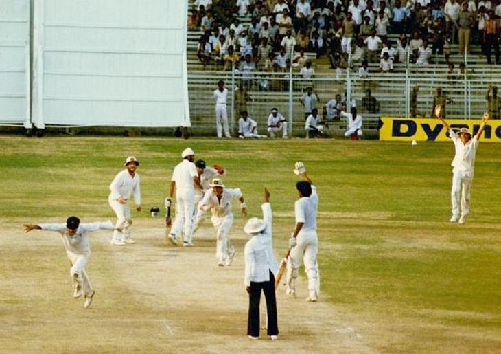 ಭಾರತದ ಸ್ಕೋರನ್ನು ಬಹಳ ಹತ್ತಿರಕ್ಕೆ ತಂದರು. ರವಿ ಶಾಸ್ತ್ರಿ 46 ರನ್‌ ಹೊಡೆದಿದ್ದರು. ಕಿರನ್ ಮೊರೆ 0, ಶಿವ್ಲಾಲ್ ಯಾಧವ್ 8 ರನ್ ಹೊಡೆದರು. 46ರಲ್ಲಿ ಇದ್ದ ರವಿ ಶಾಸ್ತ್ರಿ ಒಂದು ರನ್ ಹೊಡೆದು ಎರಡೂ ಕಡೆ ಸ್ಕೋರ್ ಸಮನಾಗಿ ಮಾಡಿದರು. ಆಟ ಮುಗಿಯಲು ಇನ್ನೂ ಎರಡು ಬಾಲ್ ಇತ್ತು. ಆದರೆ ಕೊನೆಯ ಬ್ಯಾಟ್ಸ್ಮನ್‌ರಾಗಿ ಬಂದ ಮಣಿಂದರ್ ಸಿಂಘ್ ಮ್ಯಾಥ್ಯೂಸ್‌ರ ಐದನೇ ಬಾಲಿಗೆ ಎಲ್ ಬಿ ಡಬಲ್ಯು ಆಗಿ ಔಟಾದರು! ಮ್ಯಾಚ್ ‘ಟೈ’ ಯಲ್ಲಿ ಮುಕ್ತಾಯಗೊಂಡಿತು! ಎರಡು ತಂಡಗಳು ತಲಾ 744 ರನ್‌ಗಳನ್ನು ಮಾಡಿ ಮ್ಯಾಚ್ ‘ಟೈ’ನಲ್ಲಿ ಕೊನೆಗೊಂಡಿತು.